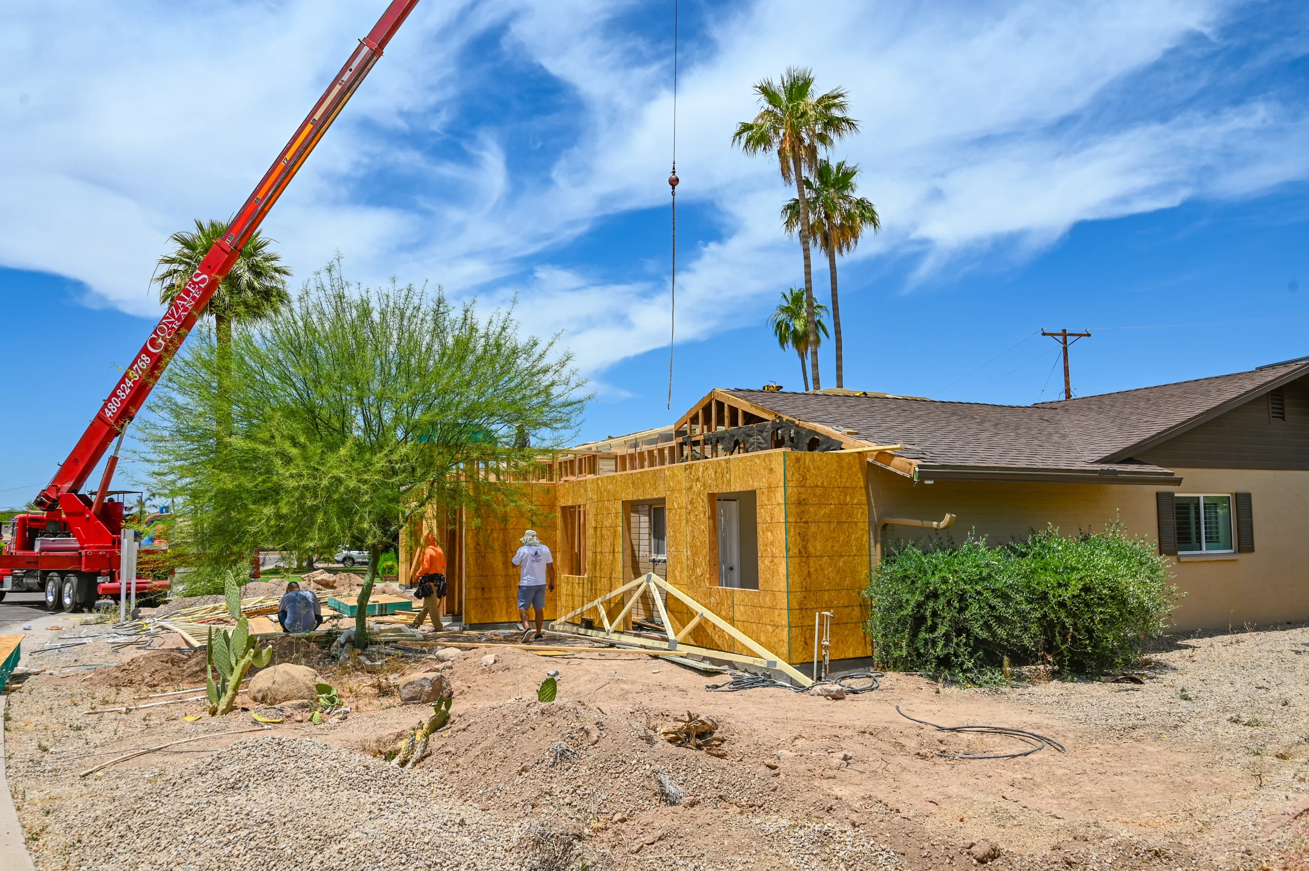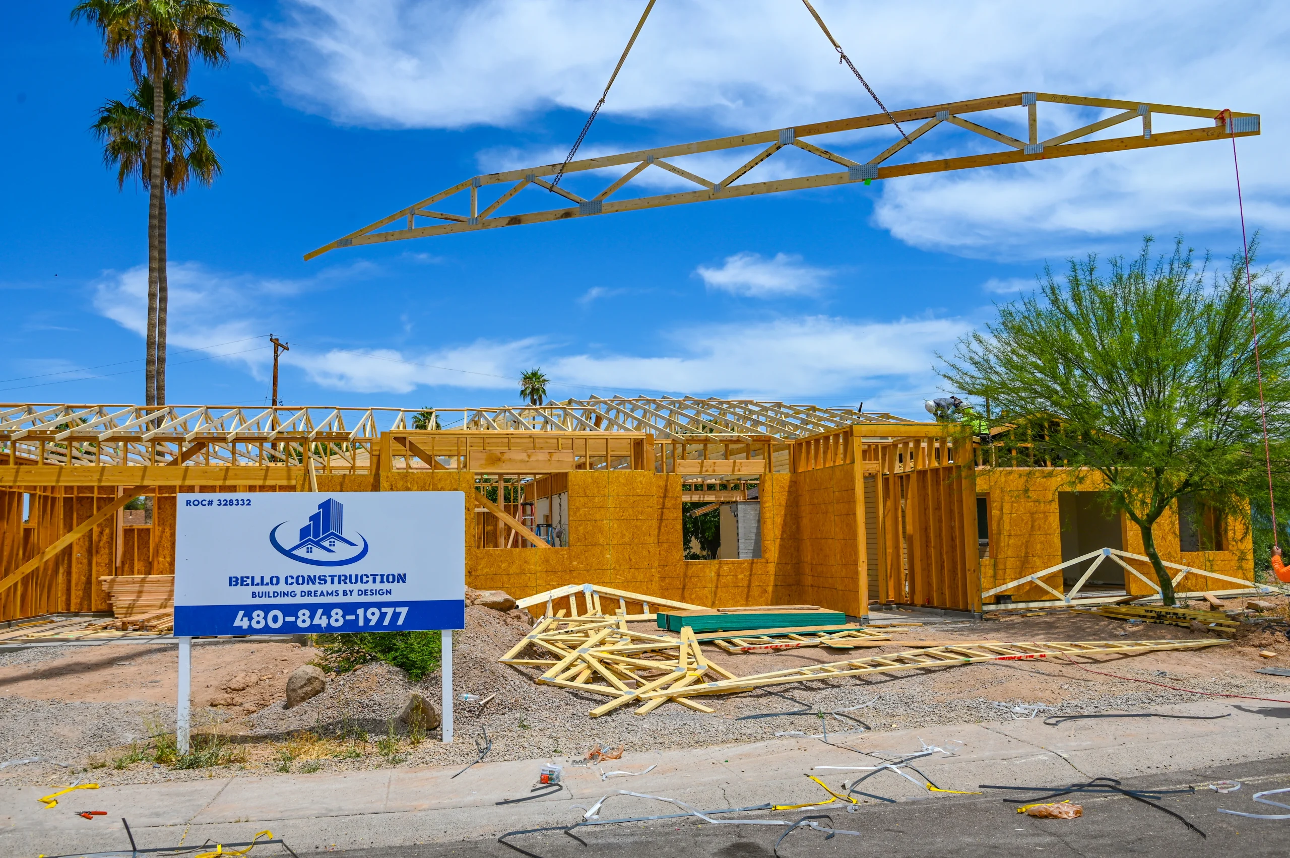 Structural framing, MEP installation, and finish work